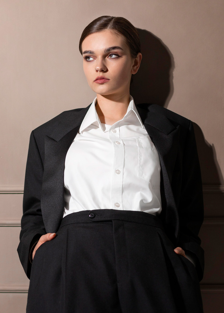 - Look Profesional: Pantalones negros + camisa blanca + blazer.