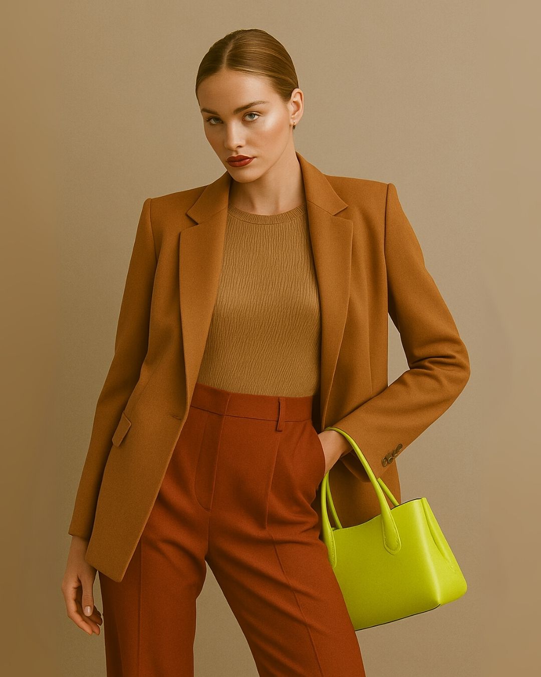 Beige, camel, terracota… pero combinados con toques inesperados como lima neón, rosa ciclamen o azul eléctrico. El contraste cromático aporta energía sin perder sofisticación.