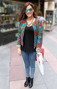 Lleva un look con toque colorido que sigue creando tendencia esta temporada y que la convierte en una bomber. ¡Combinado con negro siempre resulta una mezcla ganadora!